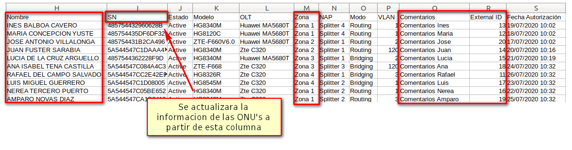2Con el archivo descargado con nombre "ONUs Autorizadas - Mi empresa.csv", editaremos la información de nuestro interés. Recuerde que solo los campos mencionados al inicio de esta documentación se podrán modificar.