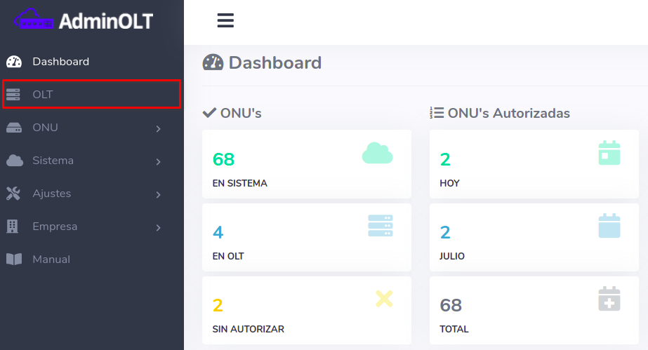 1 Inicie sesión en su cuenta de AdminOLT por medio del dominio que se le brindo en un principio y acceda al apartado, OLT
