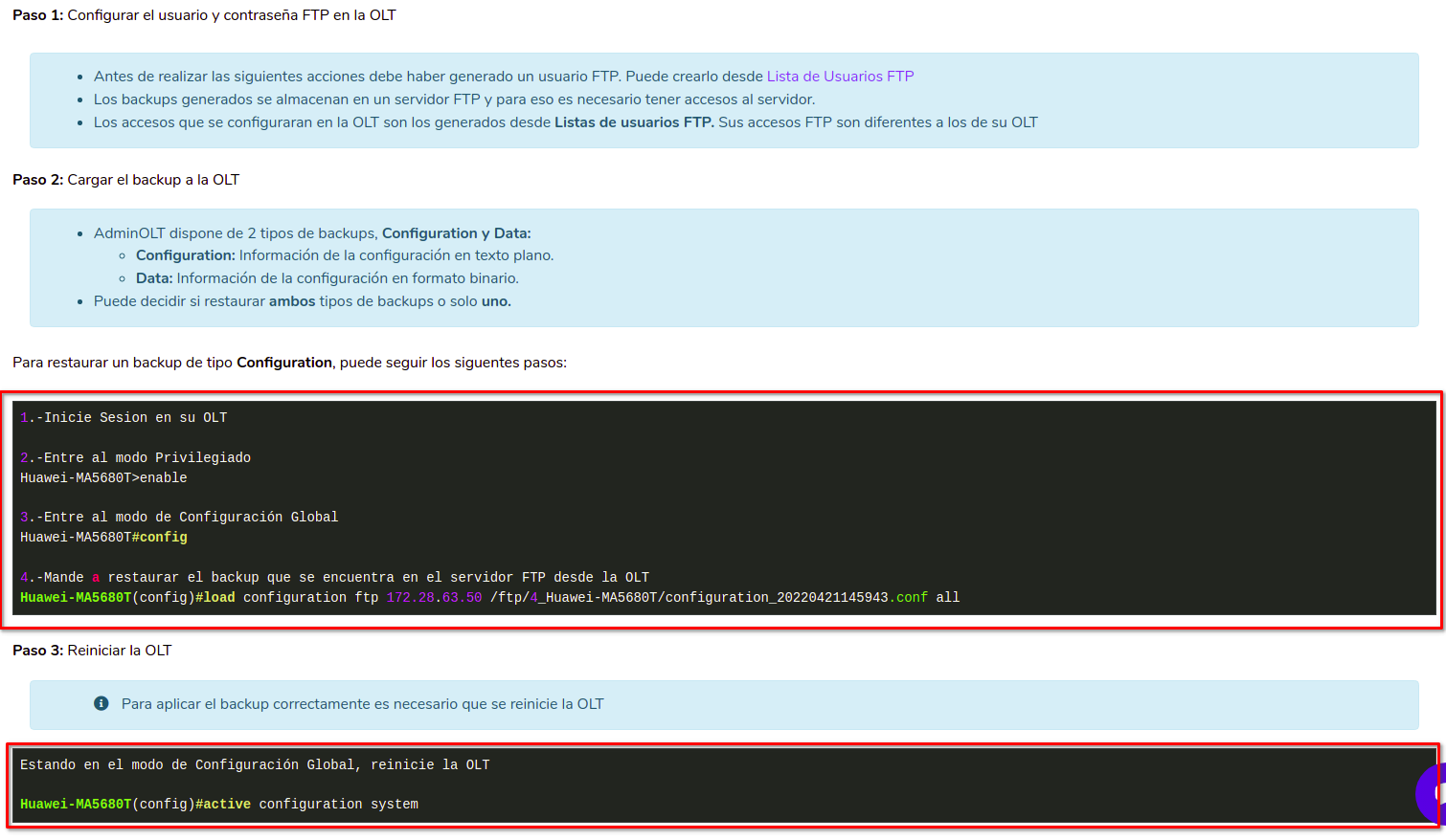 Como lo puede leer, la OLT necesita reiniciarse después de cada restauración, le recomendamos hacer esta acción con precaución