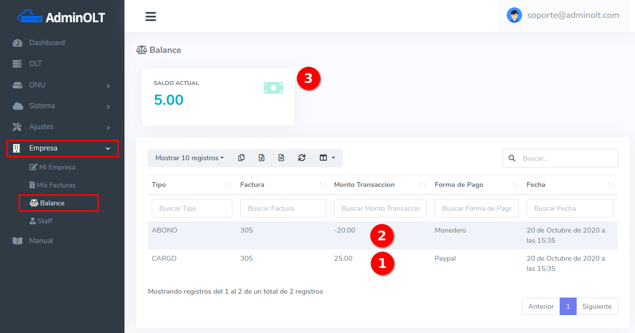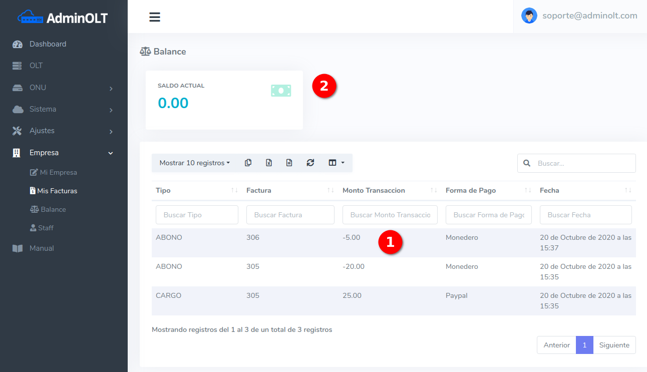 - Balance: Saldo actual con el que cuenta para pagar facturas.