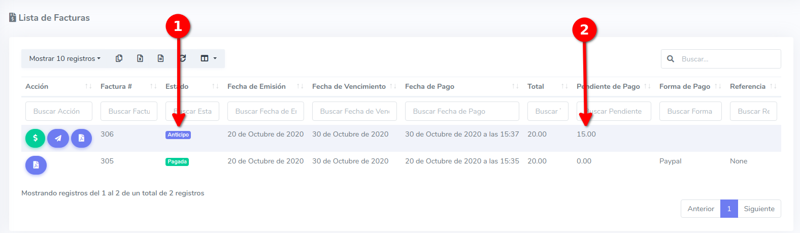 - Total pendiente de pago: Ya que la factura es de un total de 20 usd y se han abonado 5 usd, la factura tiene un pago pendiente de 15 usd.