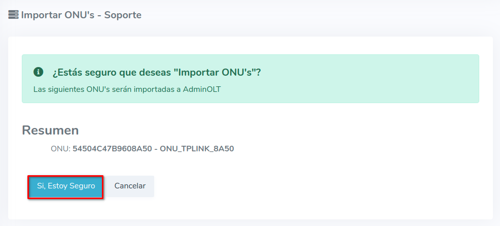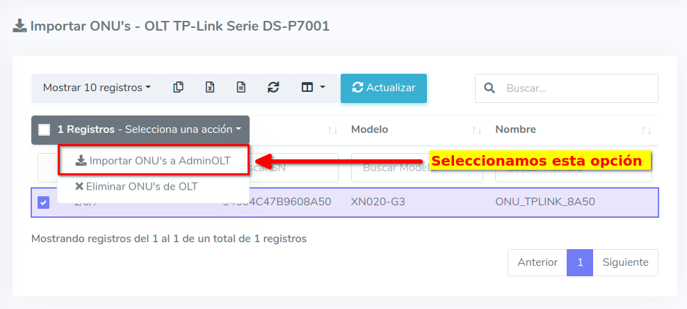 3Una vez que hayamos seleccionado los equipos, importamos las ONU's al sistema AdminOLT