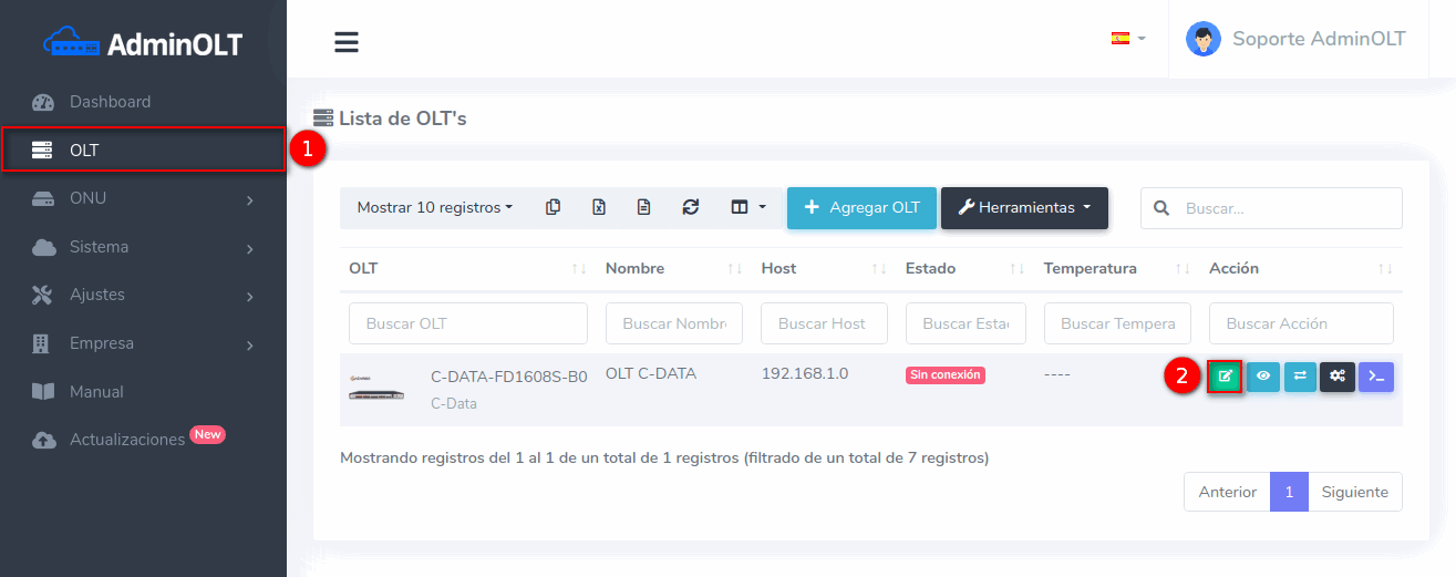 1 En la Lista de OLT's seleccionamos el equipo que deseamos conectar. La OLT ya debe estar registrada en AdminOLT.