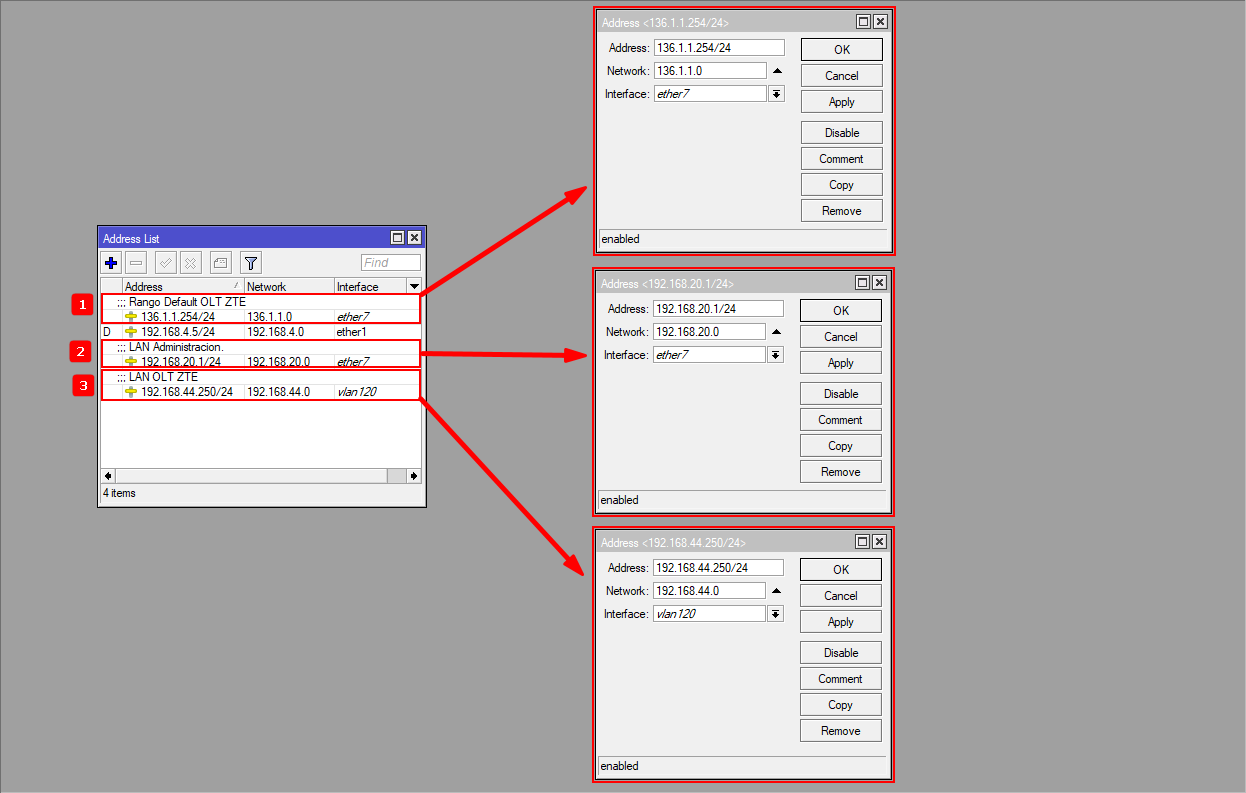 - 1.- Agregamos el segmento default de la OLT: 136.1.1.254/24 para que el Mikrotik tenga comunicación con la OLT