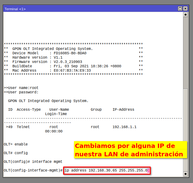 3 Debemos probar la conexión con la OLT con la ip default que se asignó