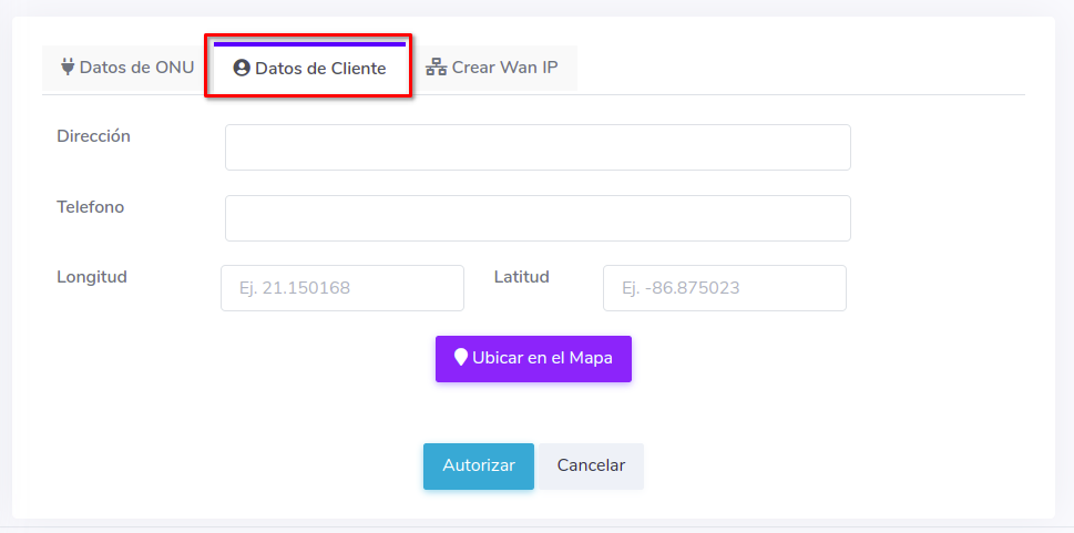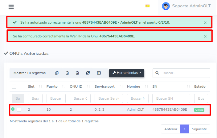 3Despues de guardar los datos de la ONU, se nos redirigira a la vista de ONU's autorizadas donde podremos ver las ONU's que hemos autorizado.