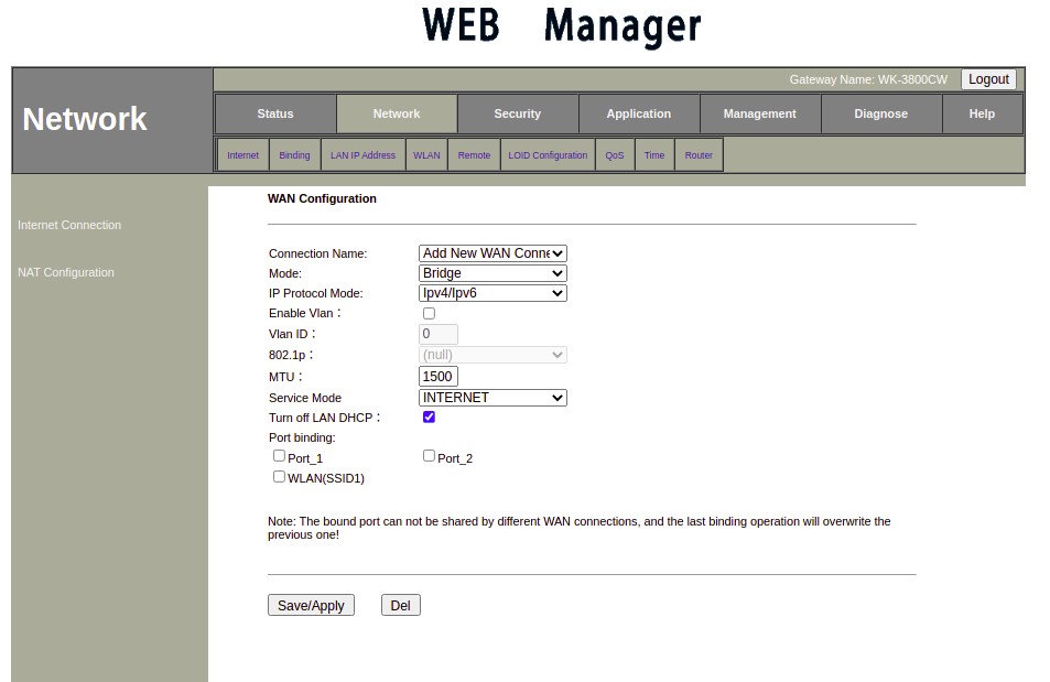 - 8.-Modo de WAN: El modo de WAN puede ser ROUTE o BRIDGE.