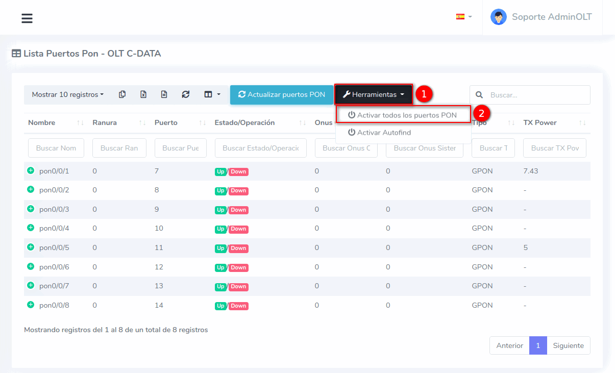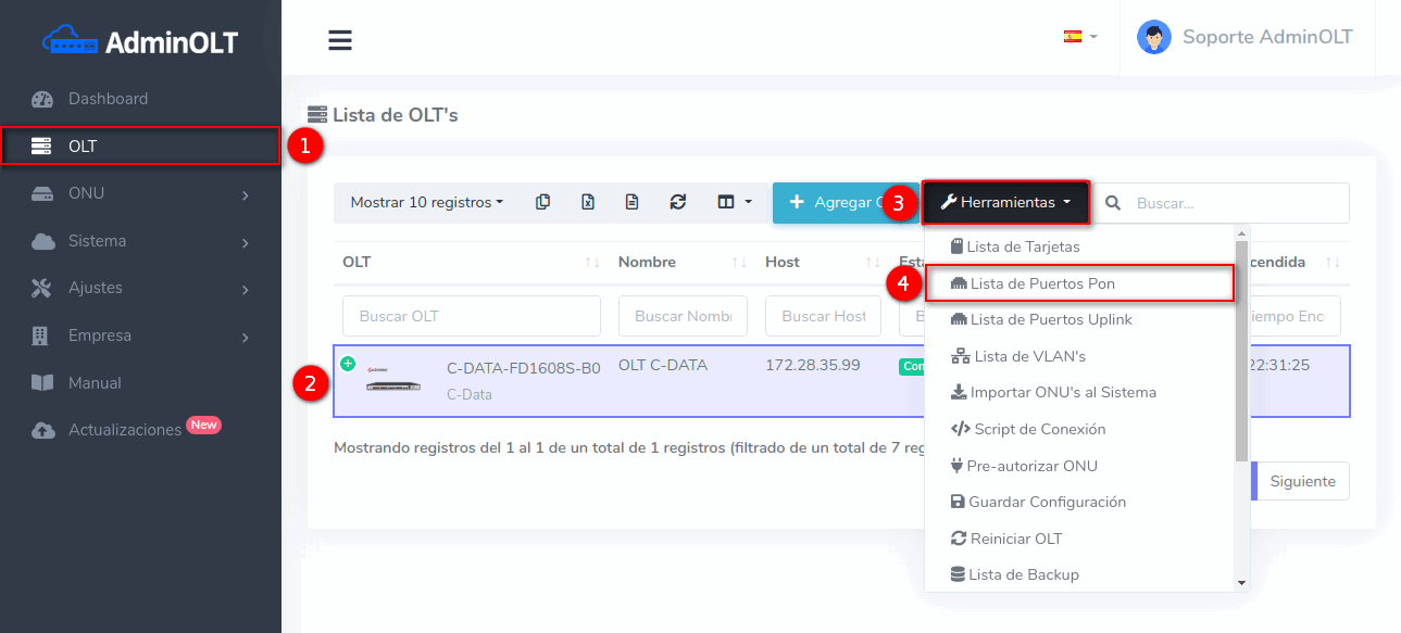 1 Ir a Lista de Puertos PON de nuestra OLT