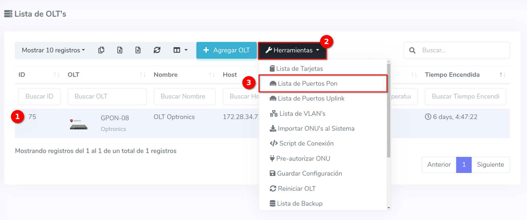 1 Ir a Lista de Puertos PON de nuestra OLT