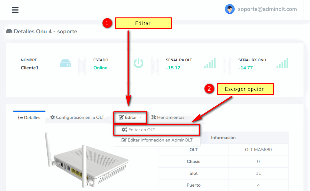 Editar ONU en AdminOLT desde Detalles de ONU