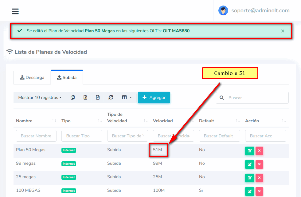 Al modificar un Plan de Velocidad, por ejemplo, de 50 megas a 51 Megas los clientes actuales relacionados al plan se verán afectadas, por lo tanto su nueva velocidad seria de 51 megas.