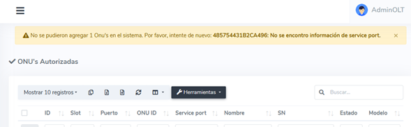En AdminOLT es importante que las ONUs se encuentren con un service-port, si la ONU no cuenta con uno, el sistema no permitira al usuario realizar la importación de esta.