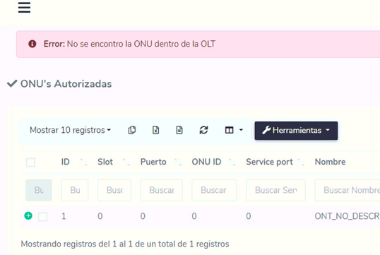 Este error, por lo general, suele aparecer cuando la ONU se desautoriza directamente desde la línea de comandos de la OLT y no es eliminada del sistema.