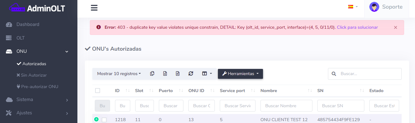 Si elimina la ONU de la lista de autorizadas y no de la OLT (es posible eliminar la ONU solo de AdminOLT y dejarla autorizada en la OLT), al intentar autorizar ese equipo nuevamente en algún otro puerto no sera posible, ya que la OLT ya tiene registrado el SN.
