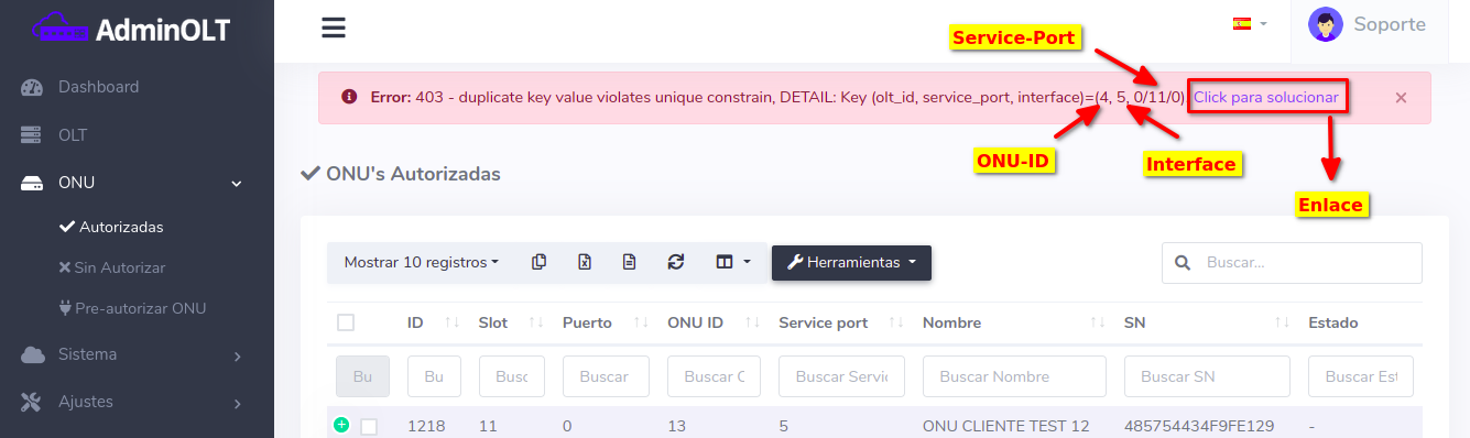 Al realizarse el proceso de autorización, la OLT ubica el próximo service-port disponible, pero tal service-port se encuentra ocupado en AdminOLT.