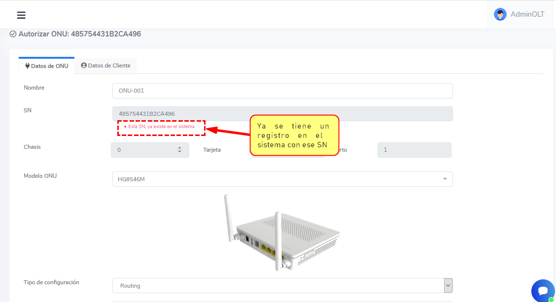 1.- Eliminar la onu de AdminOLT: Esta acción eliminar la onu de AdminOLT que causa conflictos.