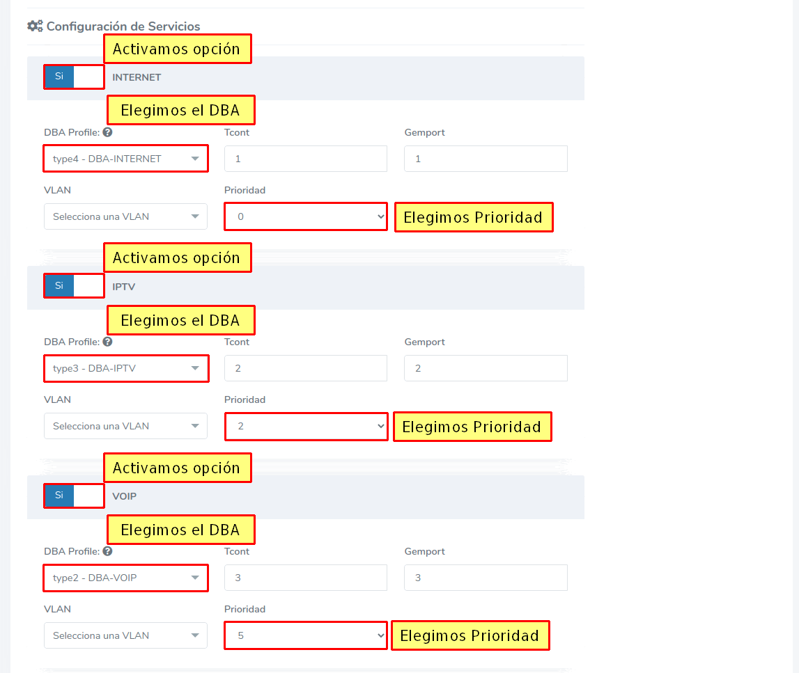 Es necesario que configuremos las VLAN de servicio que hemos creado en los puertos de nuestra onus. De esa forma, podemos designar los puertos de internet, VoIP y el de IPTV