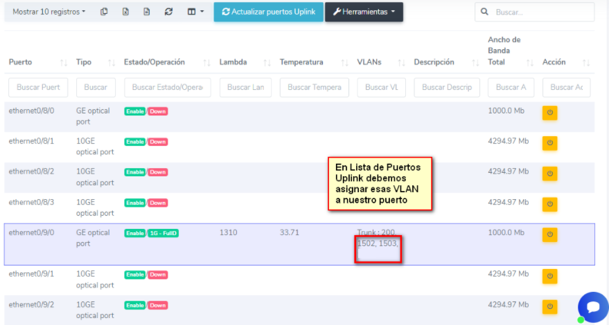 Debemos asignar esas VLAN a nuestro puerto Uplink. De forma similar, en Lista de OLT vamos a Herramientas y seleccionamos la opción Lista de Puertos Uplink,allí es donde asignaremos las tres VLAN
